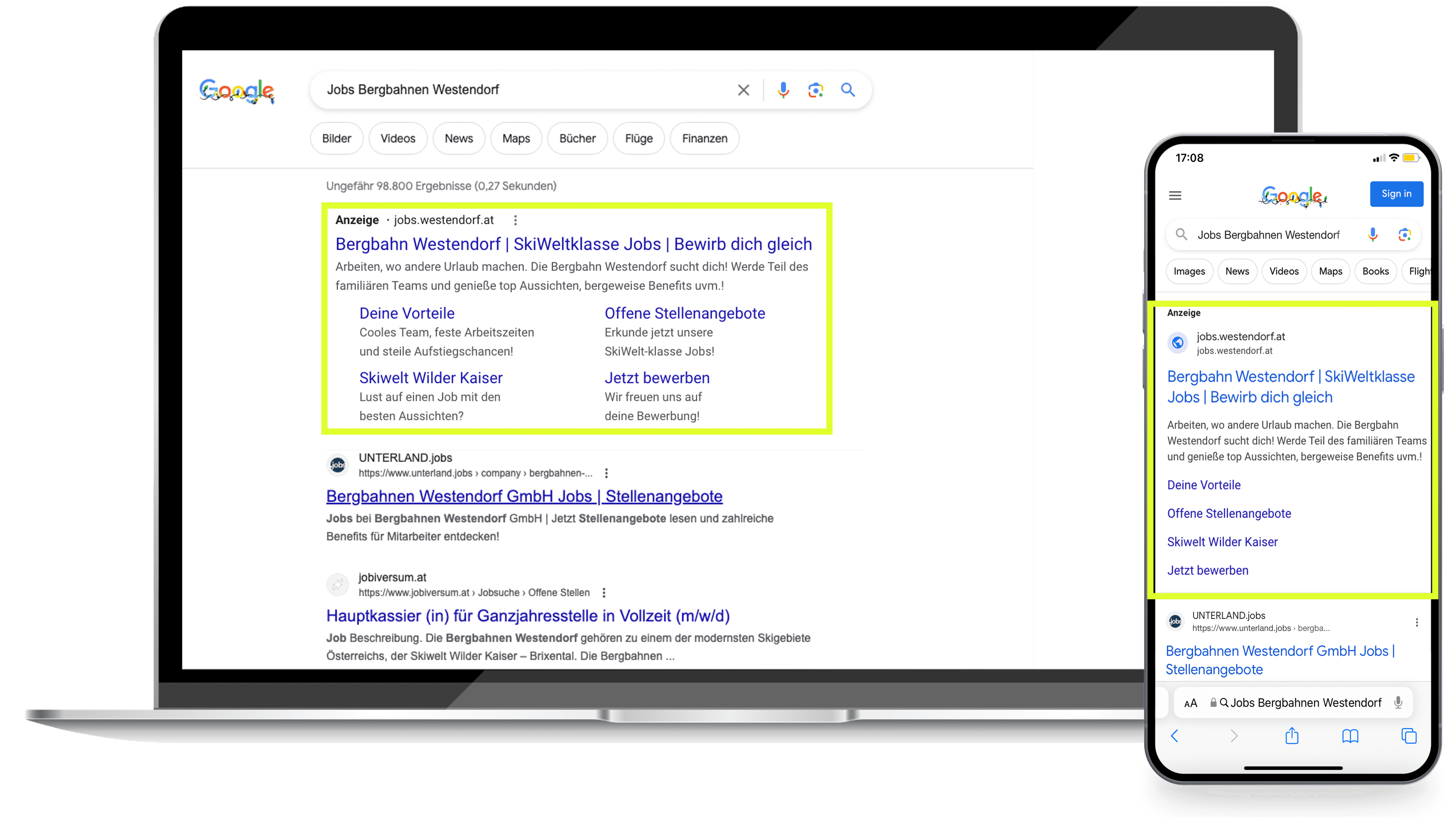 Durch gezielte Online-Maßnahmen von Oktober 23 bis Januar 24 (Google Search & Discovery / Meta) sollen geeignete Bewerber für diverse Stellen bei den Bergbahnen Westendorf gefunden werden, zunächst für die Wintersaison 23/24, jedoch auch längerfristig gedacht.