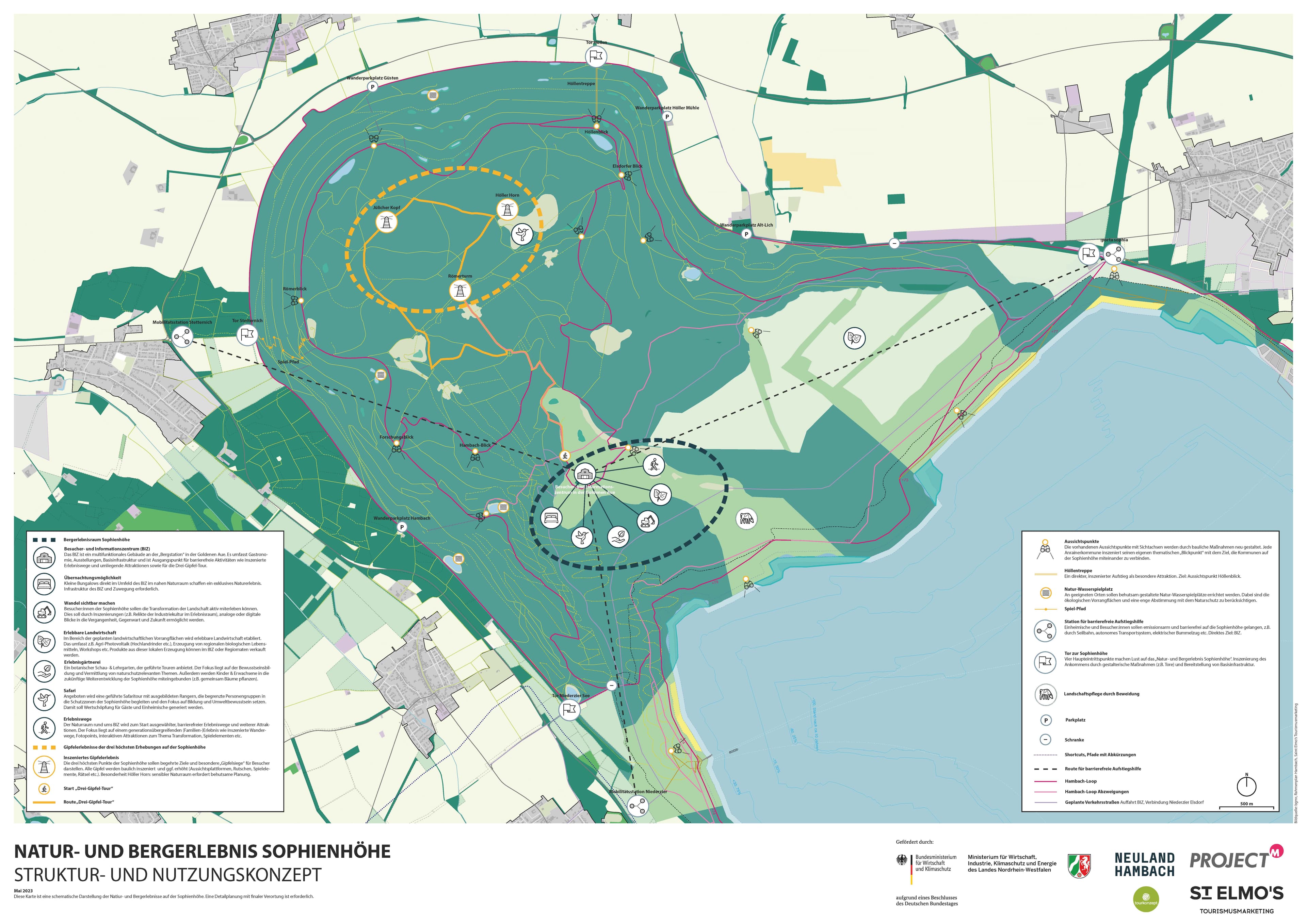 Das Gesamtkonzept Sophienhöhe wurde zwischen Oktober 2022 und Mai 2023 in regelmäßigem Austausch zwischen dem Projektteam und Auftraggeber sowie in mehreren Arbeitssitzungen (online) mit einem Lenkungskreis und der RWE Power AG abgestimmt. Gemeinsam wurde die Grundausrichtung der Sophienhöhe als einzigartiges Berg- und Naturerlebnis definiert und das touristische Angebot in der Karte des Struktur- & Nutzungskonzeptes verortet.