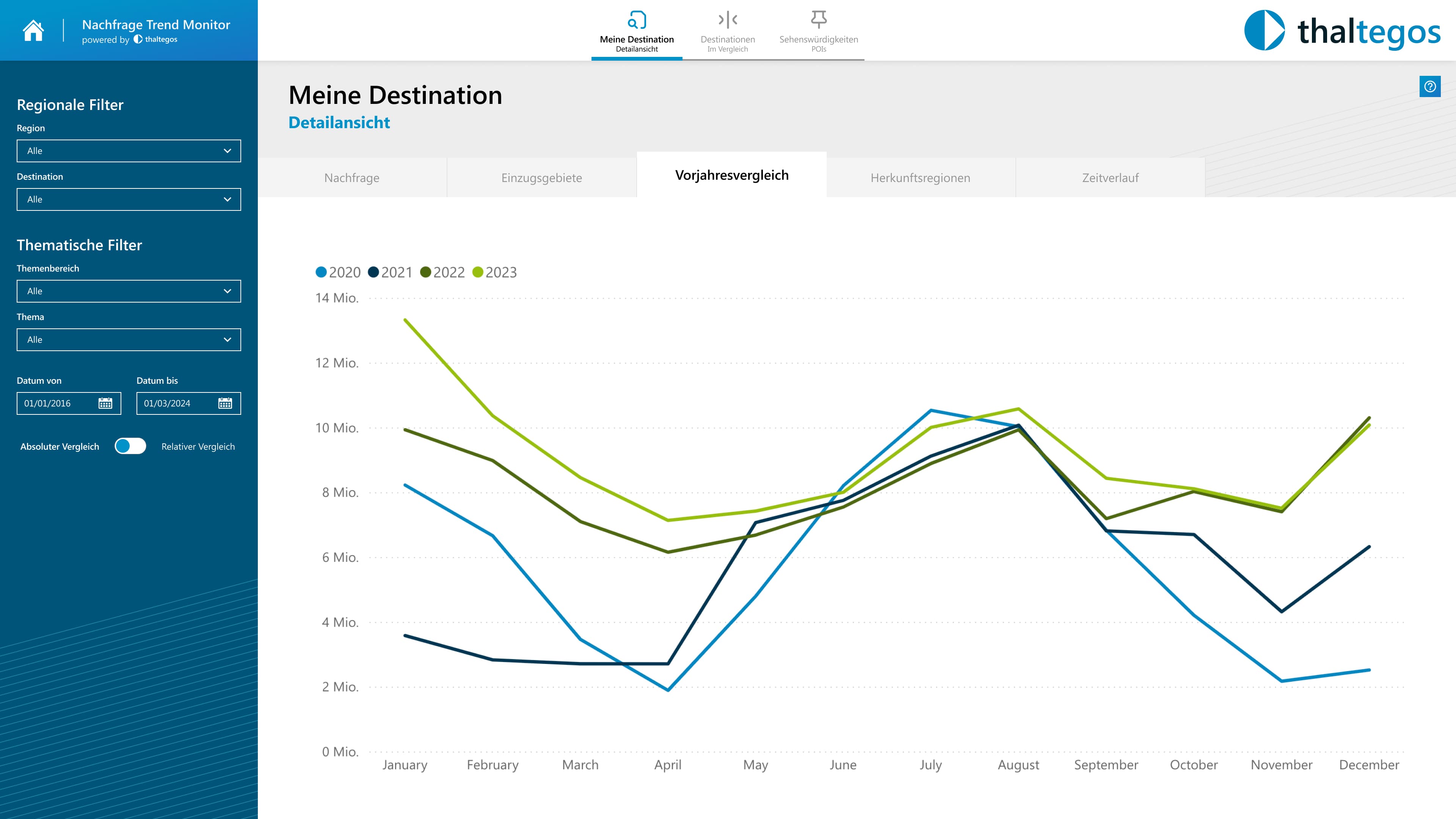Der Tourismus Nachfrage-Monitor ist einDashboard, das Ihnen ein tiefes Verständnis des Google-Suchverhaltens für touristische Regionen bietet. Mit diesem innovativen Tool erhalten Sie nicht nur einen Einblick in die aktuellen Suchtrends und -muster, sondern auch wertvolle Erkenntnisse darüber, wie potenzielle Reisende nach bestimmten Reisezielen, Aktivitäten oder Unterkünften suchen. Durch die Analyse von Echtzeitdaten ermöglicht der Tourismus Nachfrage-Monitor eine präzise Prognose des touristischen Interesses und Verhaltens Ihrer Zielgruppe.