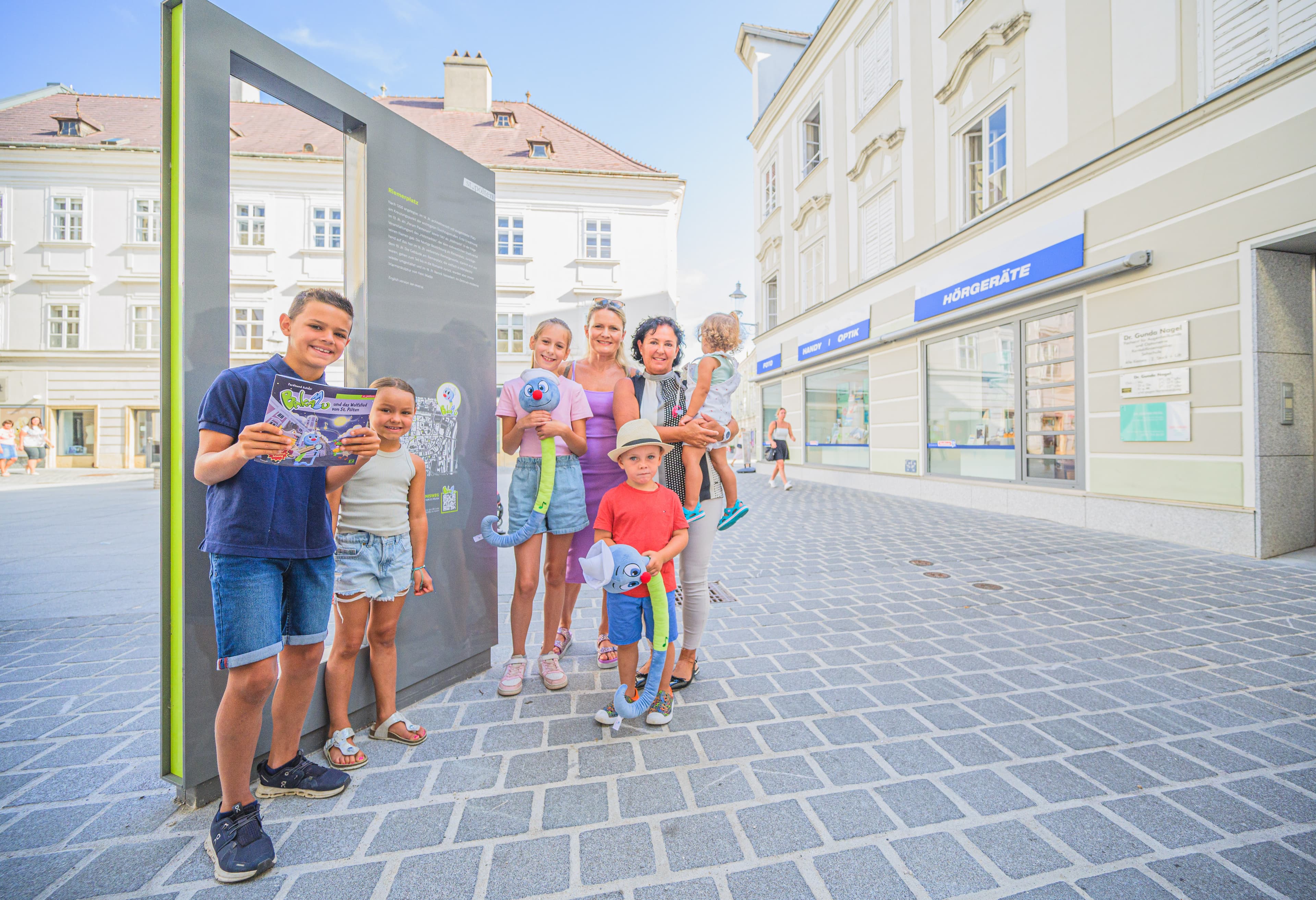 Das Ergebnis für die Weiter-entwicklung des Info- & Leitsystems in St. Pölten ist der neue Kinder-Erlebnisweg „BAKABU und das Wolfslied von St.Pölten“. Der 1,6 Kilometer lange Erlebnisweg führt vom Rathausplatz bis zum „KinderKunstLabor“ und bietet Familien mit Kindern ein interaktives Abenteuer. An insgesamt acht Stationen können unterhaltsame Geschichten als Text- oder Audio-Dateien mittels QR-Codes abgerufen werden. Für die Präsentation auf der Tonspur stellte der Schauspieler und Entertainer Christian Tramitz seine Stimme zur Verfügung. Die Geschichte rund um BAKABU gibt es außerdem auch als Begleitbuch zu erwerben.